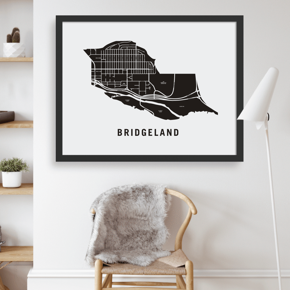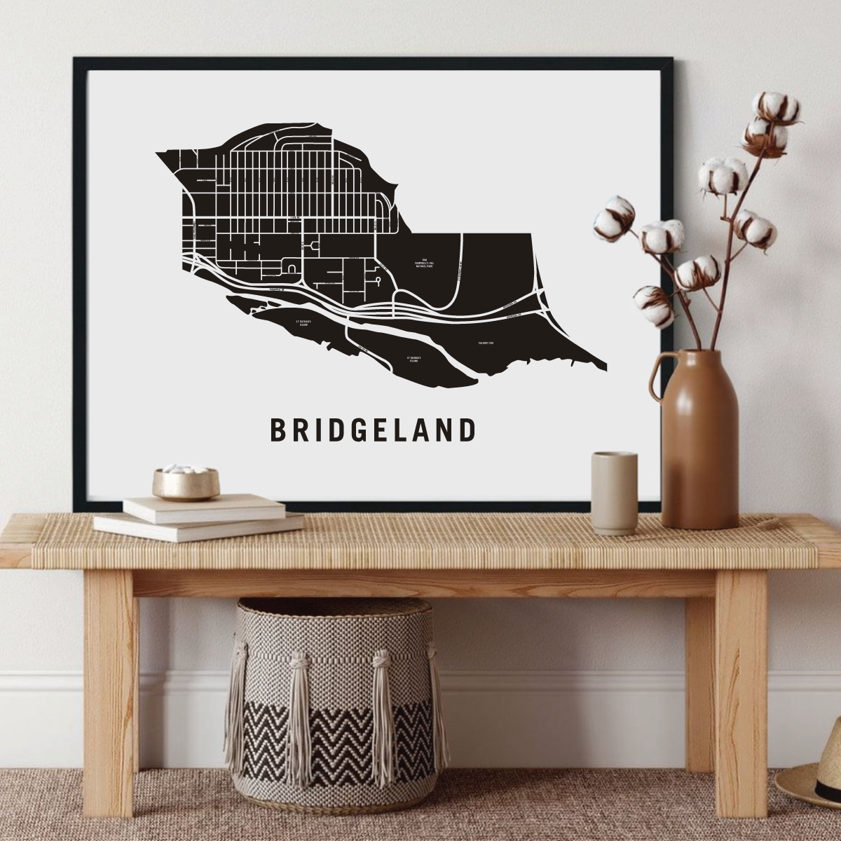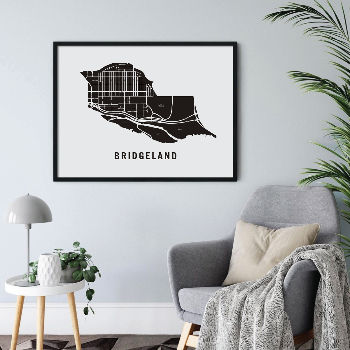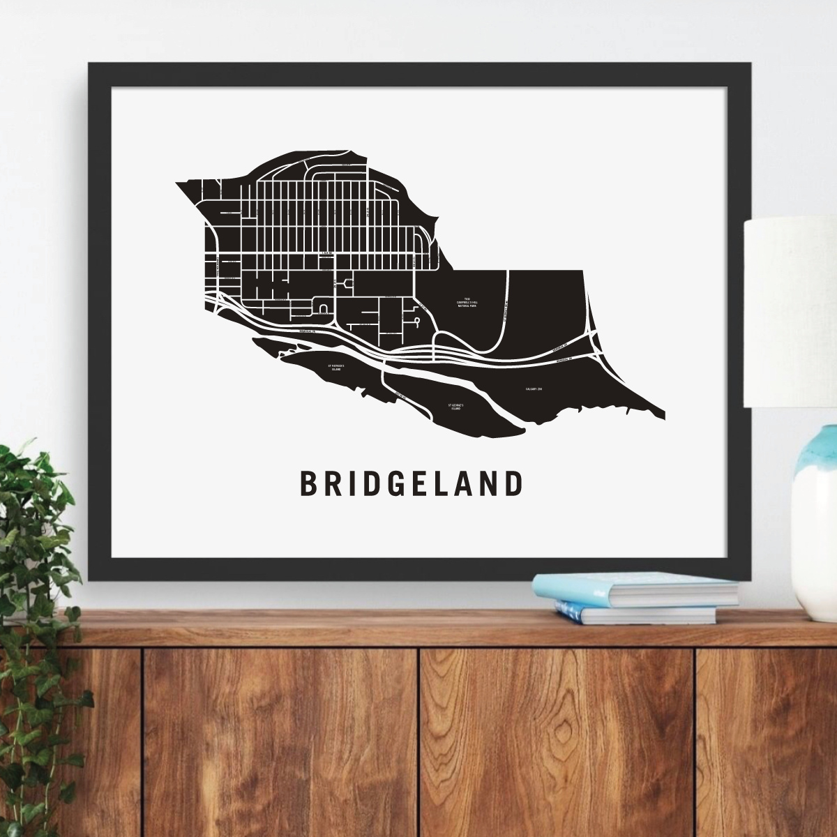 Bridgeland neighbourhood map prints make the best housewarming gift for friends and couples. The perfect gift for new homeowners who have just bought their first home. Pay tribute to your favourite neighbourhood or city and customize the map with a heart on your home location. The perfect realtor gift idea.