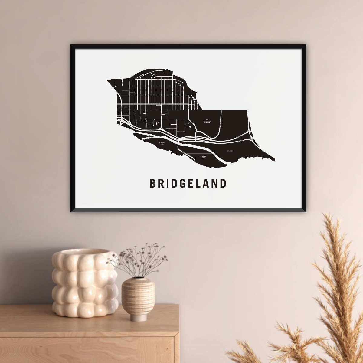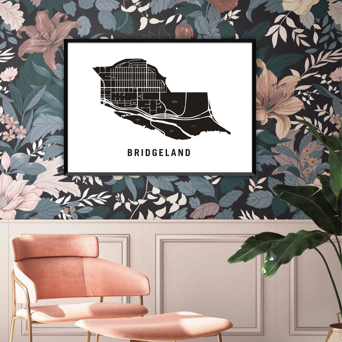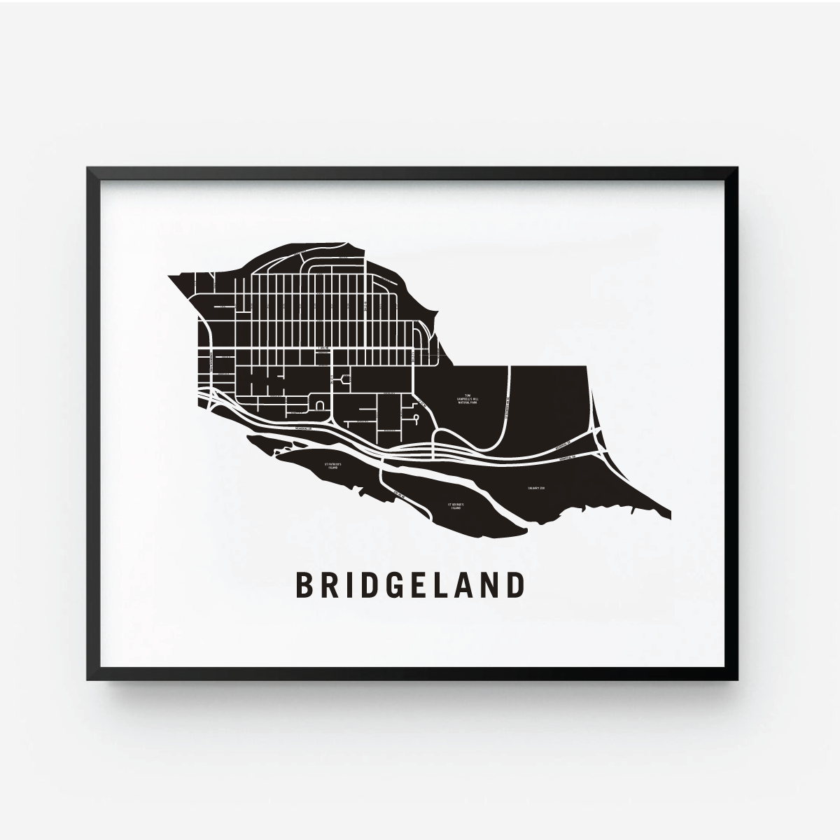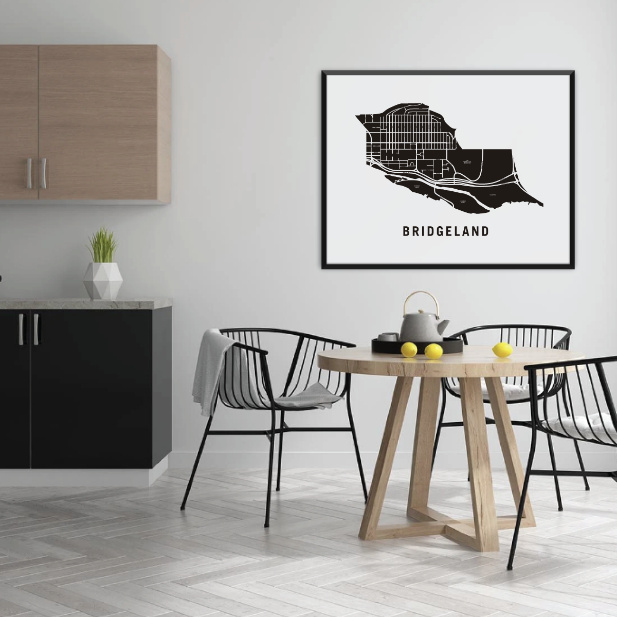 Bridgeland neighbourhood map prints make the best housewarming gift for friends and couples. The perfect gift for new homeowners who have just bought their first home. Pay tribute to your favourite neighbourhood or city and customize the map with a heart on your home location. The perfect realtor gift idea.