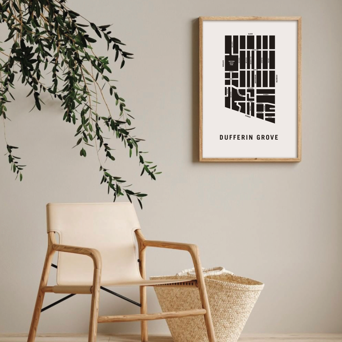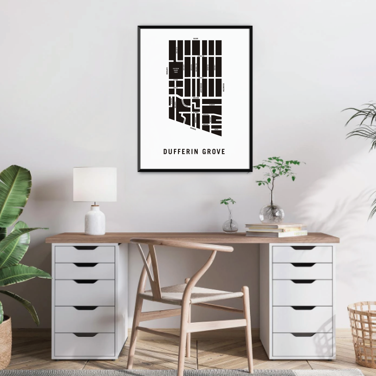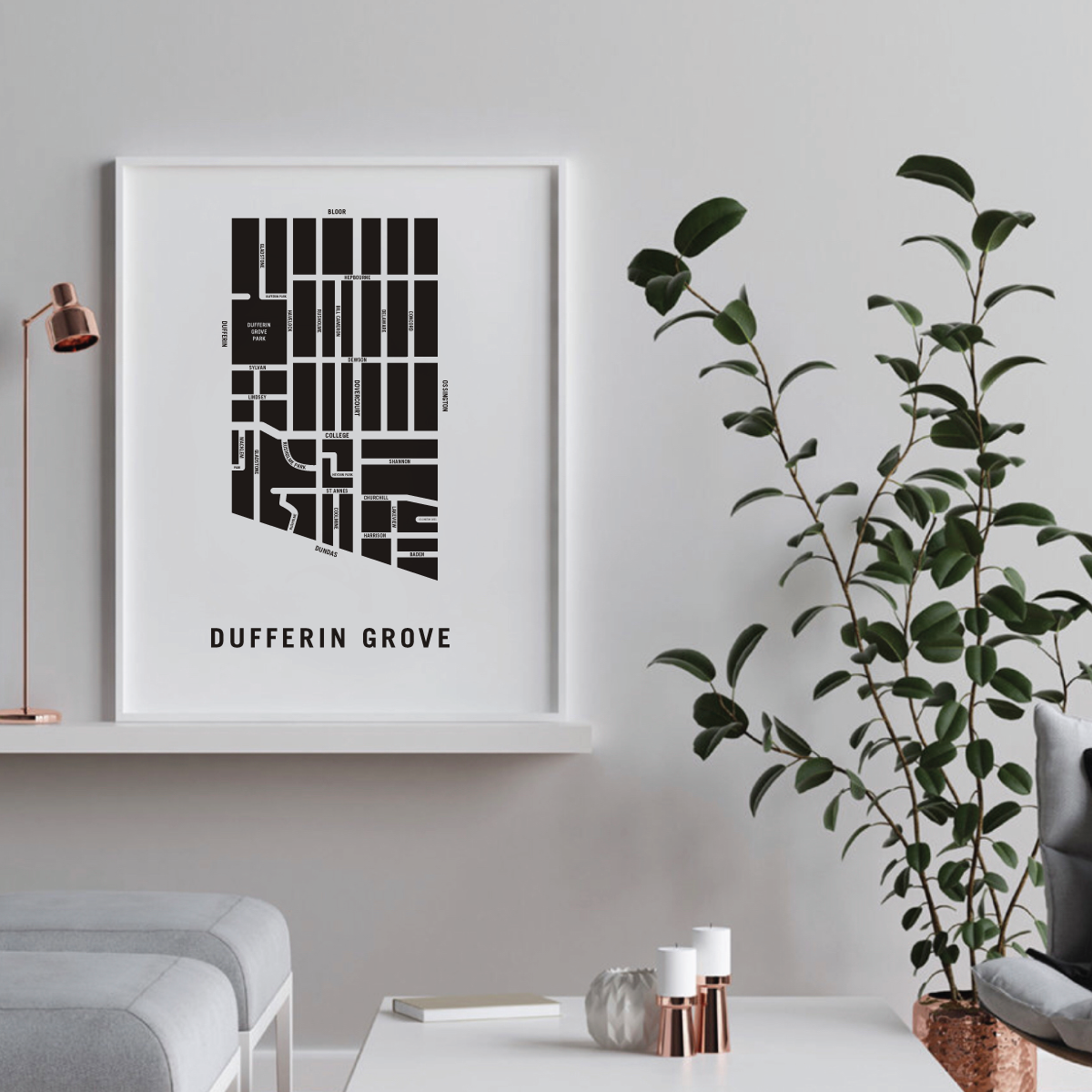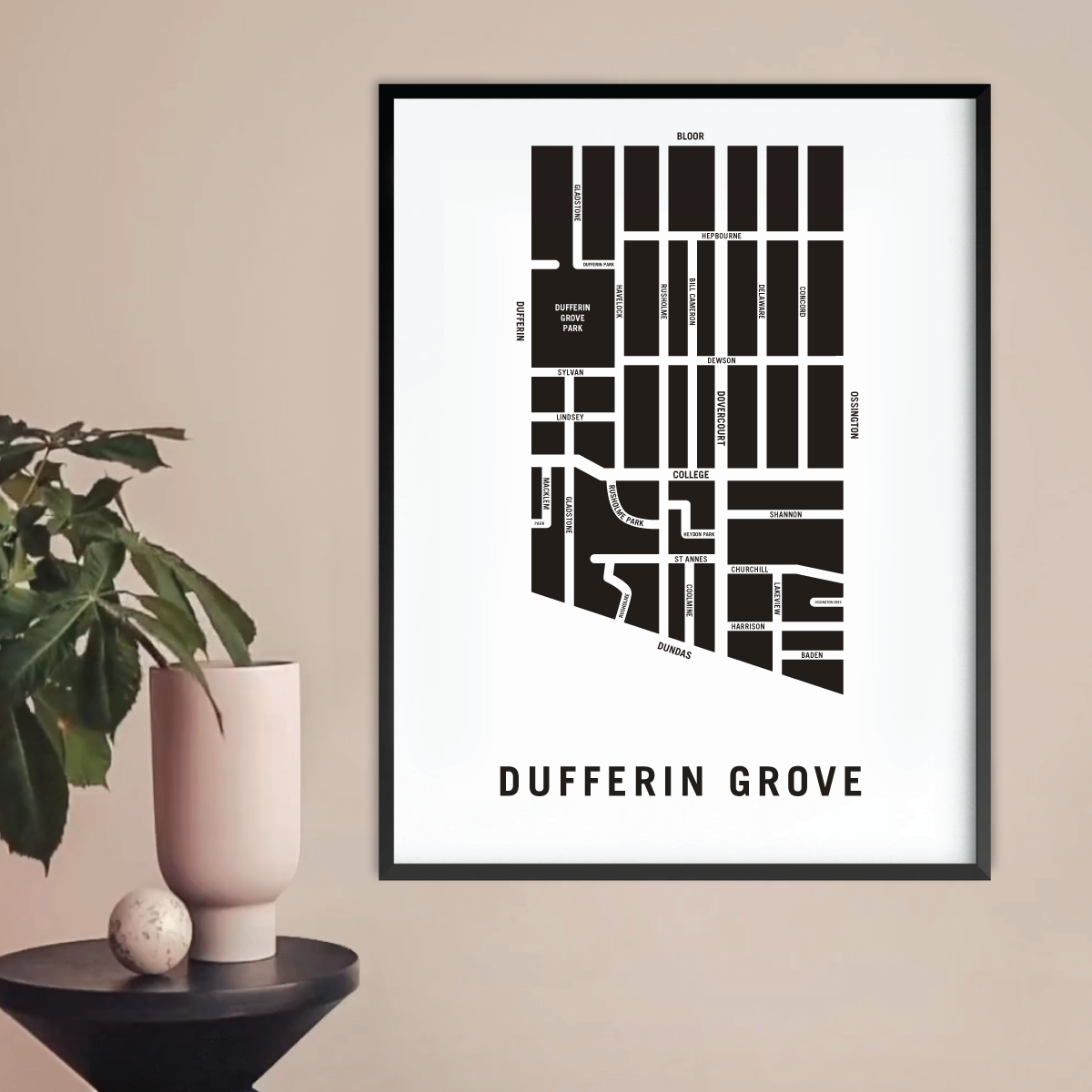 Dufferin Grove neighbourhood map prints make the best housewarming gift for friends and couples. The perfect gift for new homeowners who have just bought their first home. Pay tribute to your favourite neighbourhood or city and customize the map with a heart on your home location. The perfect realtor gift idea.