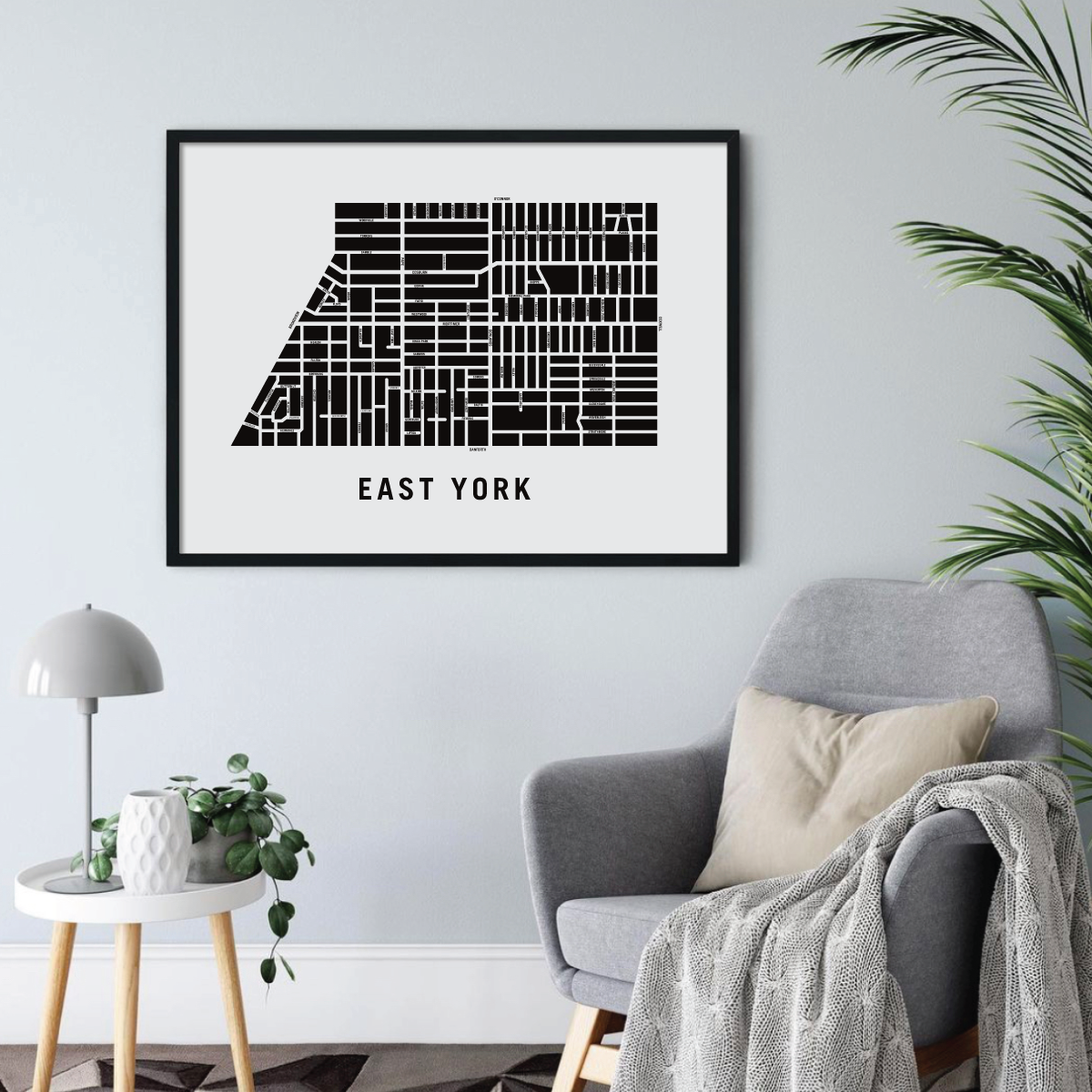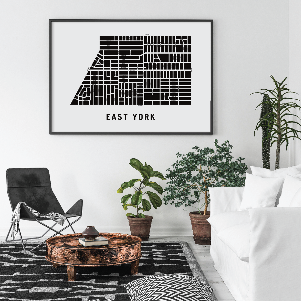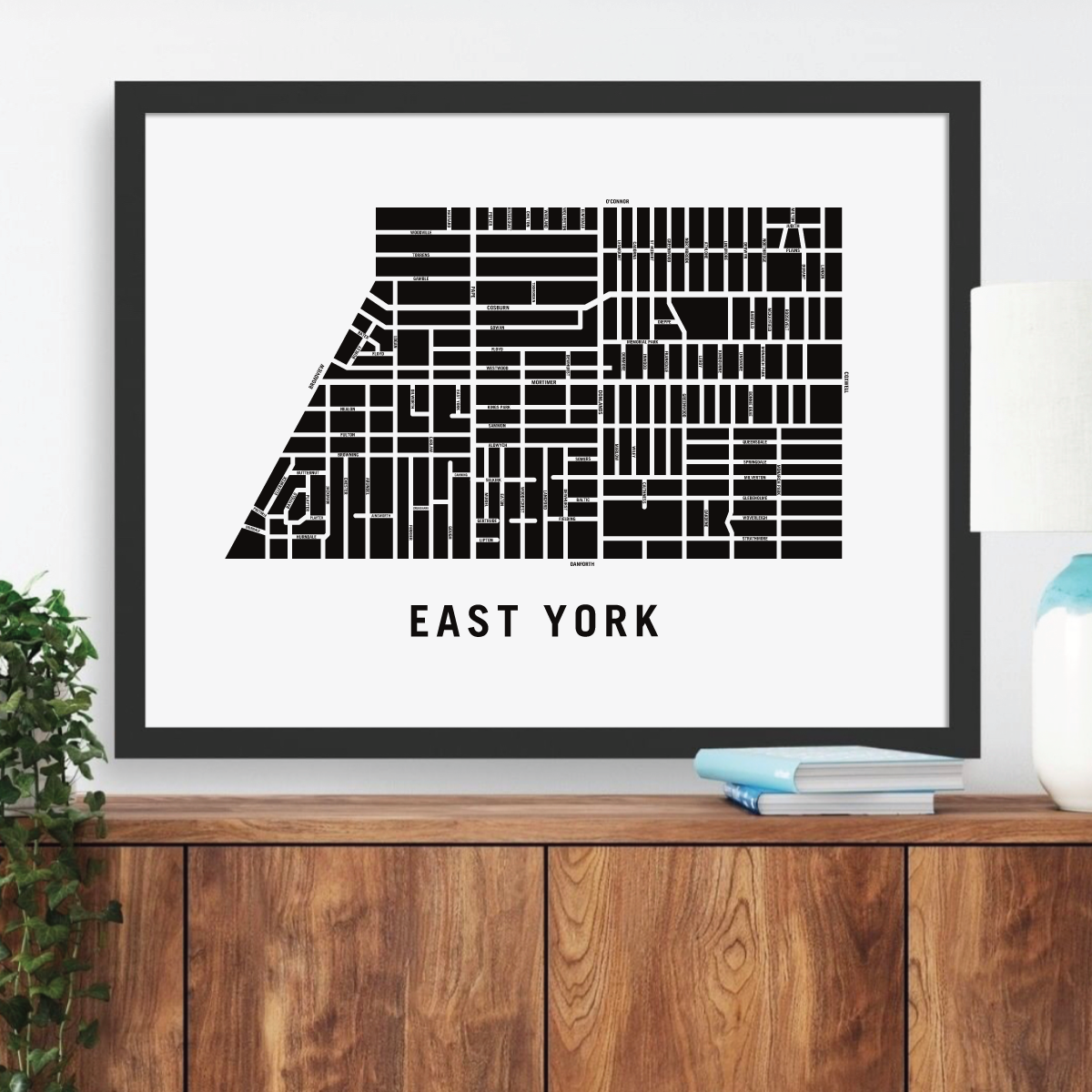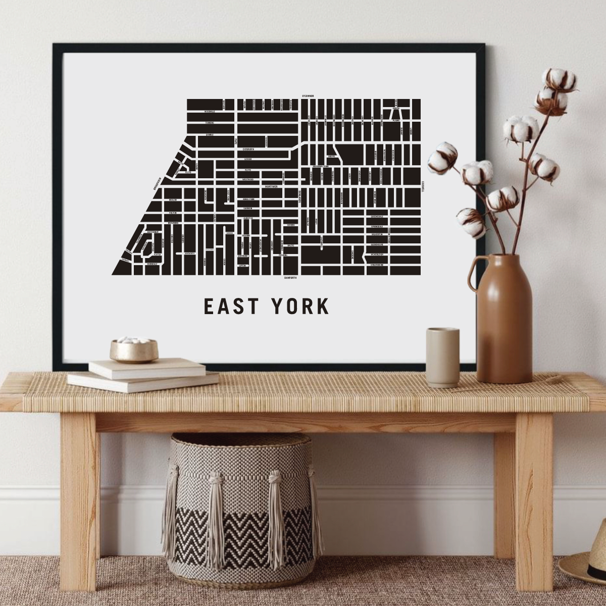 East York neighbourhood map prints make the best housewarming gift for friends and couples. The perfect gift for new homeowners who have just bought their first home. Pay tribute to your favourite neighbourhood or city and customize the map with a heart on your home location. The perfect realtor gift idea.