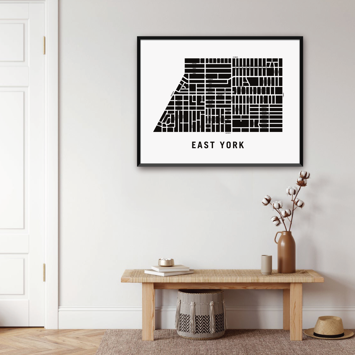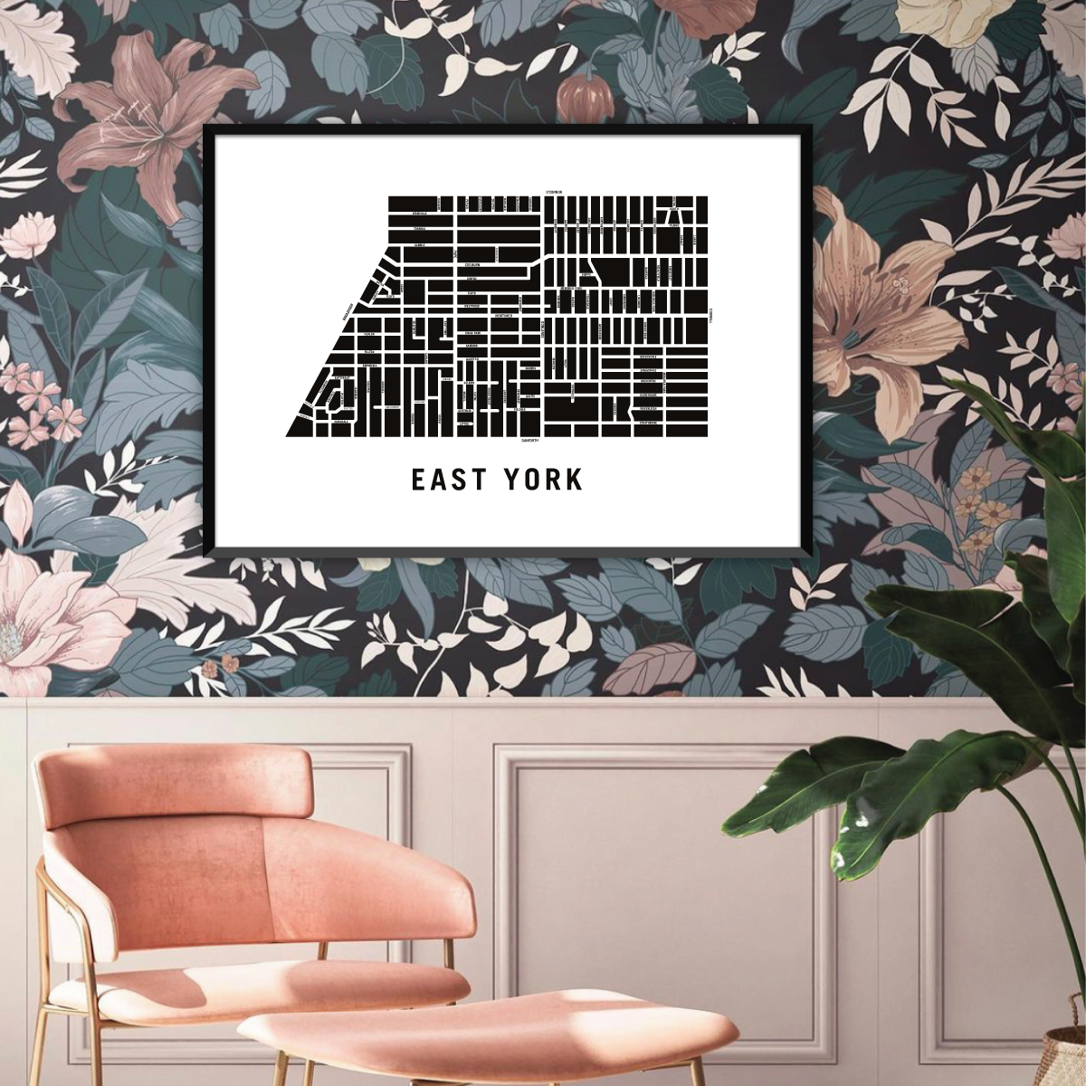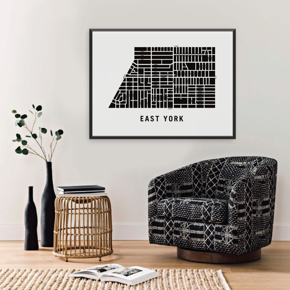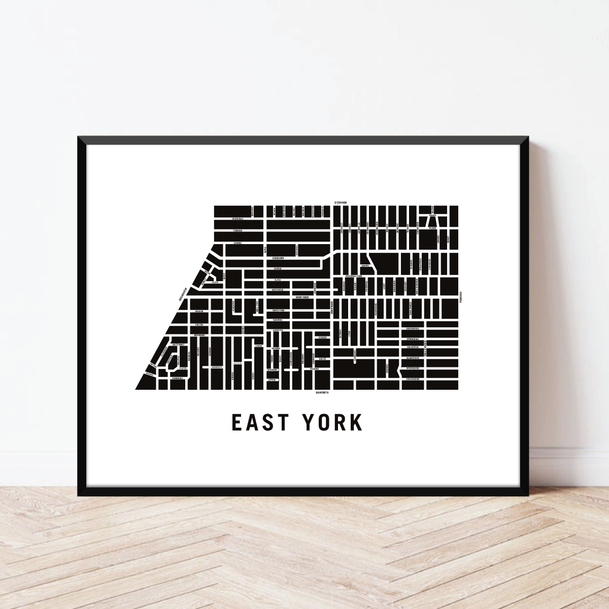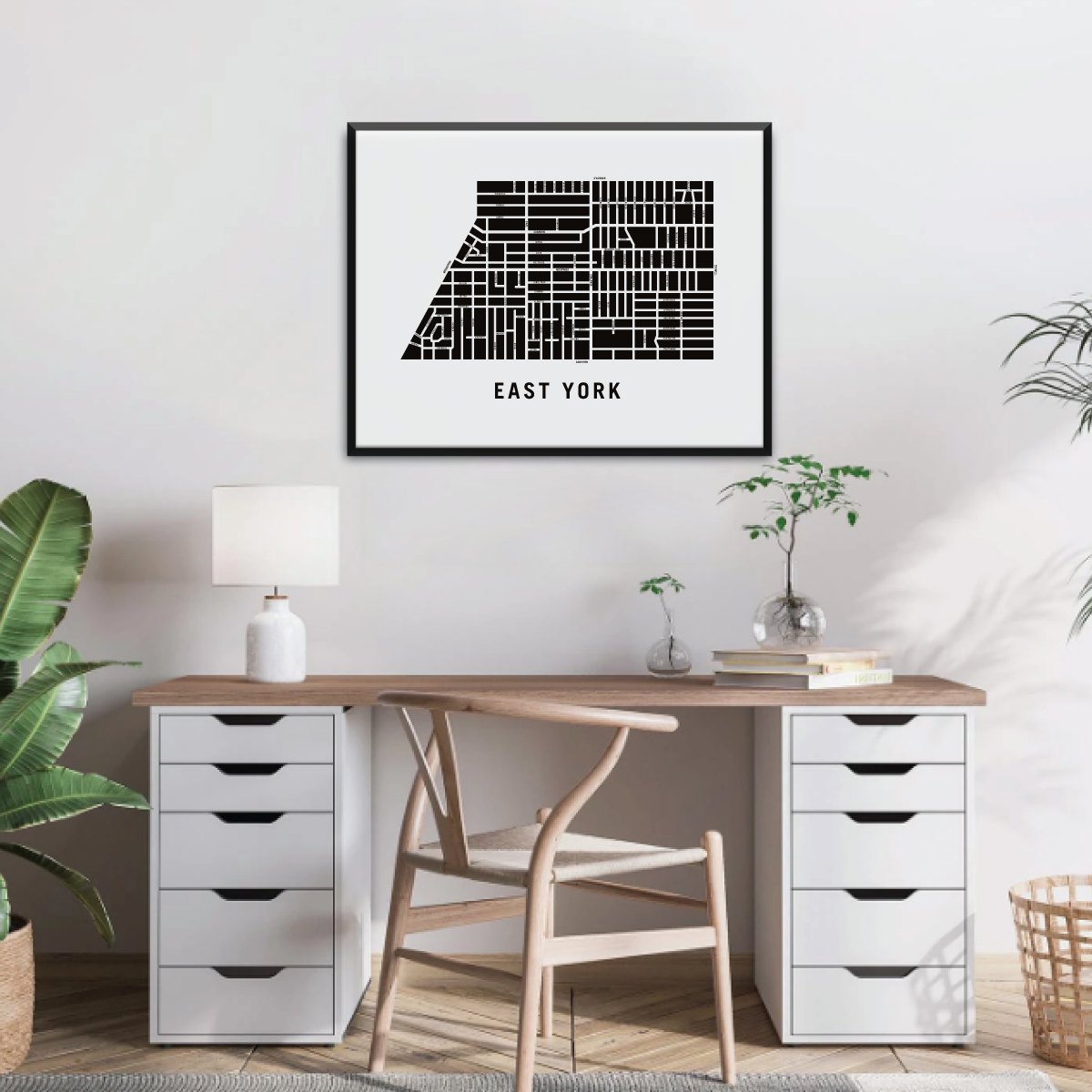 East York neighbourhood map prints make the best housewarming gift for friends and couples. The perfect gift for new homeowners who have just bought their first home. Pay tribute to your favourite neighbourhood or city and customize the map with a heart on your home location. The perfect realtor gift idea.